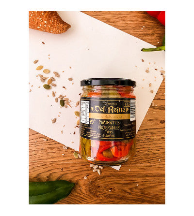 Variedad de pimiento típico de La Rioja. Buenísimos. Variedad Najerano de mucha fama en Navarra, La Rioja y Pais Vasco. Exquisitos y excelente. Especiales para guarnición, ensalada, acompañamiento de carnes y bacalao etc. Proceso de elaboración totalmente artesano. Peso neto: 445g. Producto sin gluten. COMPRA MÍNIMA - 3 UDS