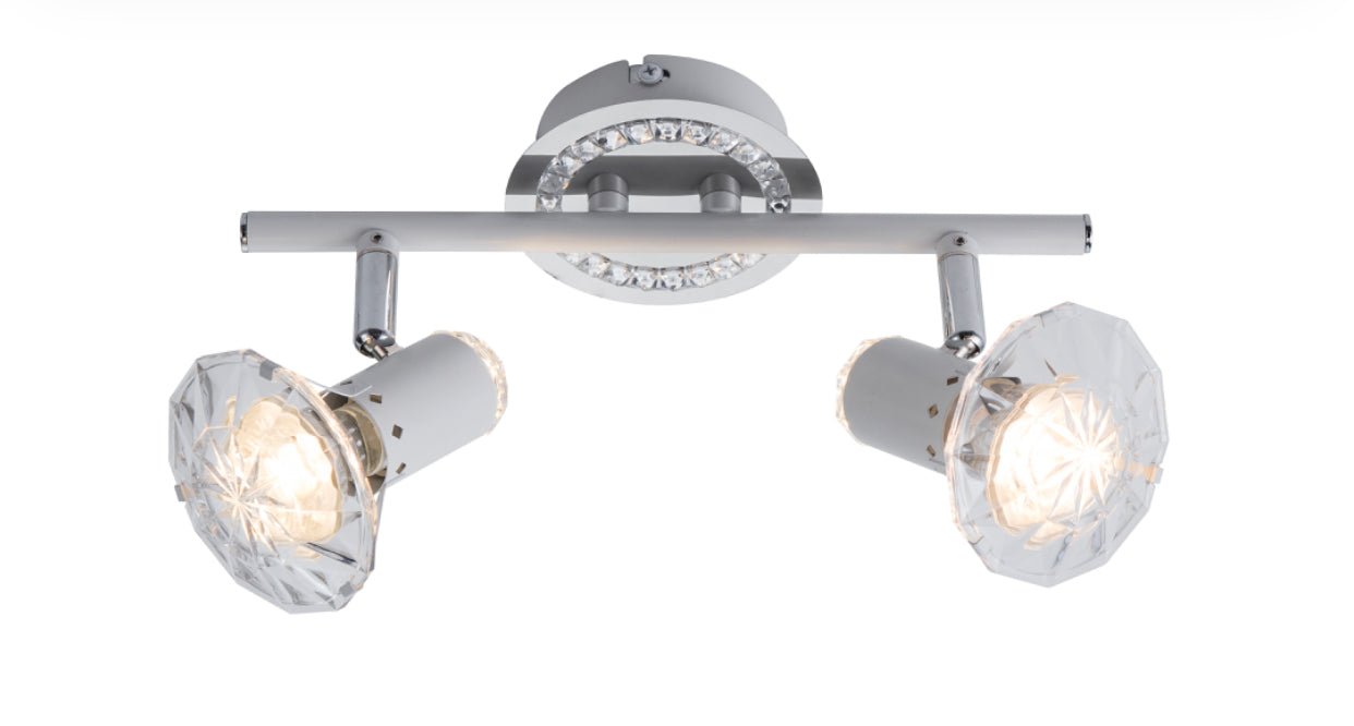 2XGU10 (Bombilla incl.) LED 5W/3000K (Cálida) Material: Cristales acrílicos, acrílico, metal Color: Blanco, cromo Dimensiones: 260x145x100mm (Largo x Alto x Diámetro) IP20 Uso Interior