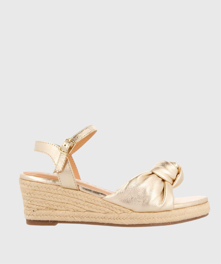 El estilo más mediterráneo con la nueva colección de Gioseppo Woman. Sandalias ligeras de piel color dorado con cierre al tobillo con hebilla y ligera cuña de yute trenzada. La plantilla es de piel con látex y acolchada, que le aporta un toque extra de confort. El forro es de piel curtida en tenerías que siguen un proceso de curtición más sostenible bajo los estándares de Leather Working Group. Piso ligero y flexible.