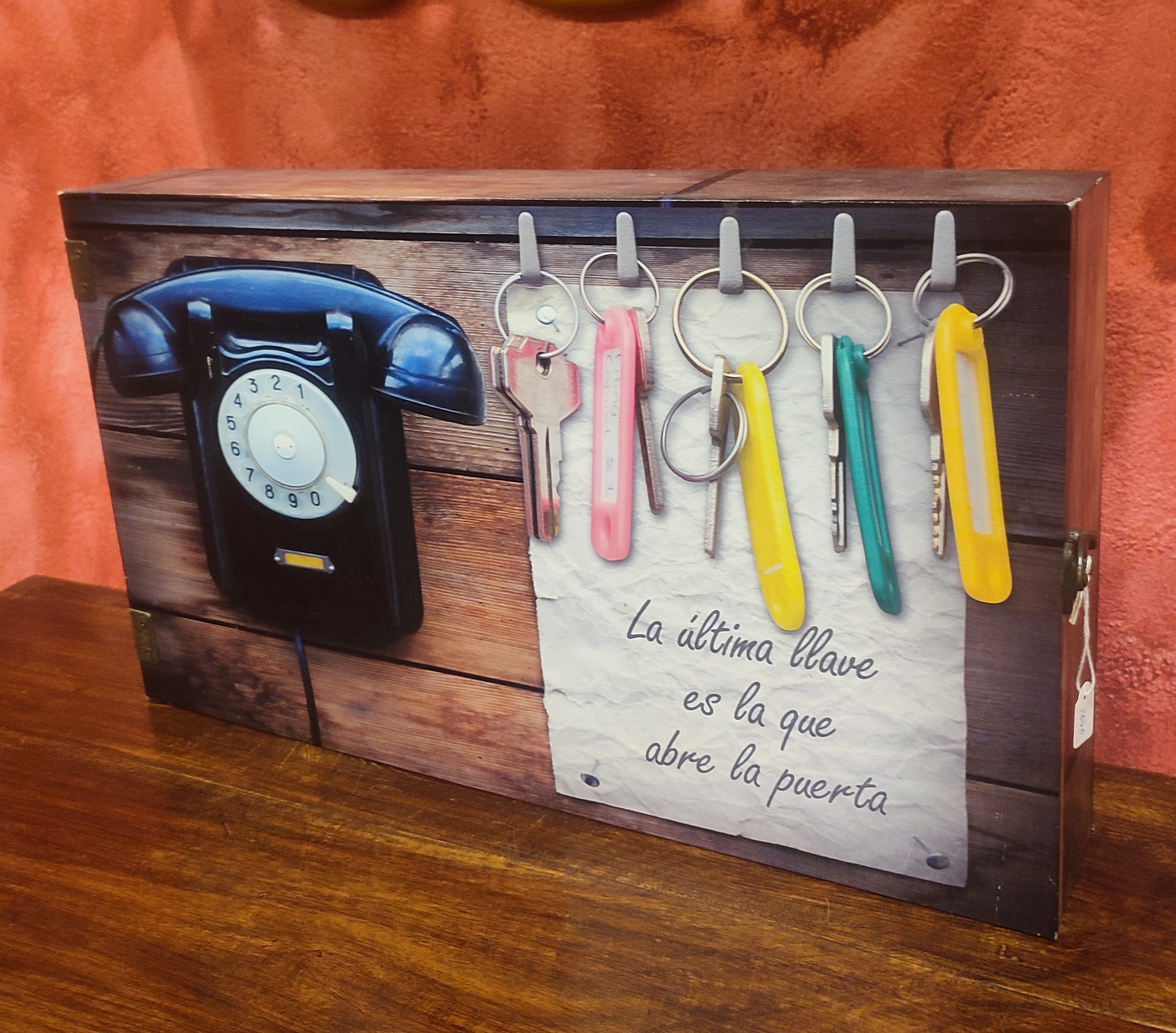 Esta decorado con una imagen de un telefono con una serie de llaves.