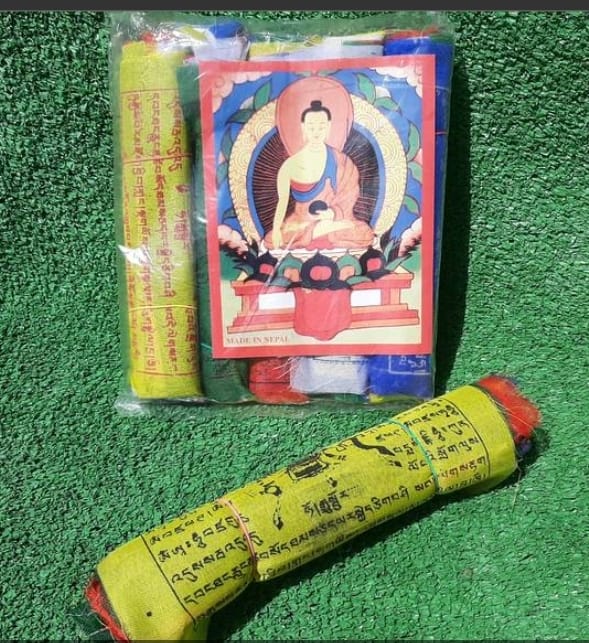 - Mantras y simbolos: Las banderas suelen estar impresas con mantras, que son frases sagradas que favorecen la paz, la compasion y la sabiduria. El mantra mas comun es "Om Mani Padme Hum", asociado con la compasion.